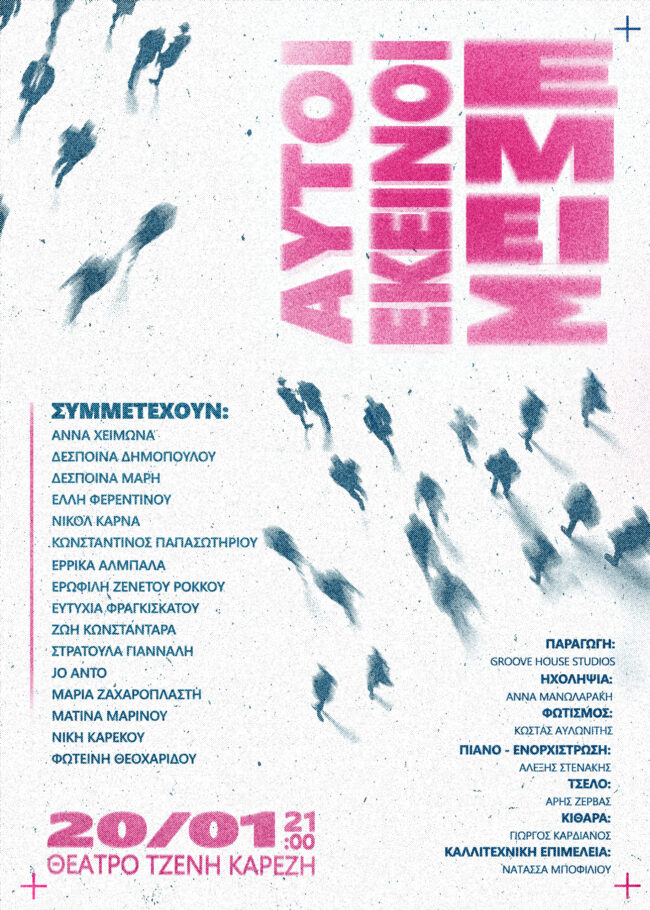 “Αυτοί, Εκείνοι, Εμείς” Μαθητές της μουσικής σχολής Groove House Studios, του τμήματος ΕρμηνευτικήςΠροσέγγισης της Νατάσσας Μποφίλιου μπαίνουν στην σκηνή του Θεάτρου ΤζένηΚαρέζη την Δευτέρα 20 του Γενάρη. Ως γη γόνιμη που καλλιεργείται με αξίες και ιδανικά συστήνονται και παρουσιάζουντη συλλογική τους δουλειά.Άλλοτε μελαγχολικοί, άλλοτε χαρούμενοι, άλλοτε εσωστρεφείς, σε κάθε περίπτωσηόμως γοητευτικοί, μοιράζονται τους προβληματισμούς και…